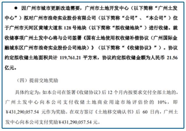 广州浪奇公告称,因城市改造需要,有一块地要被广州市土地开发中心收储,如果在规定时间内完成交付,最高可获得补偿款达25.87亿元,这金额是去年净利润的78倍。