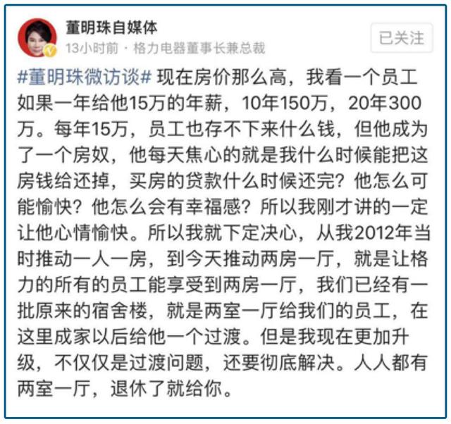 去年董明珠直接开火“房价再高,跟你有啥关系?”“只要是格力人,我保证,我也承诺,一人一套房!”