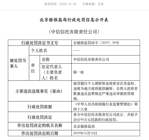 12月19日晚间,银保监会挂出两张罚单,中信信托、建信信托被北京因保监局处罚,均被责令改正并处90万元罚款。处罚决定均在12月10日作出。