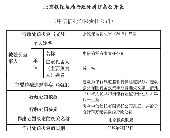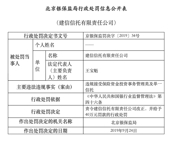 中信信托、建信信托已经是年内第三次吃到罚单,此前两度违规被罚。