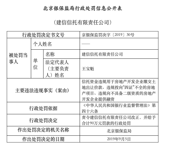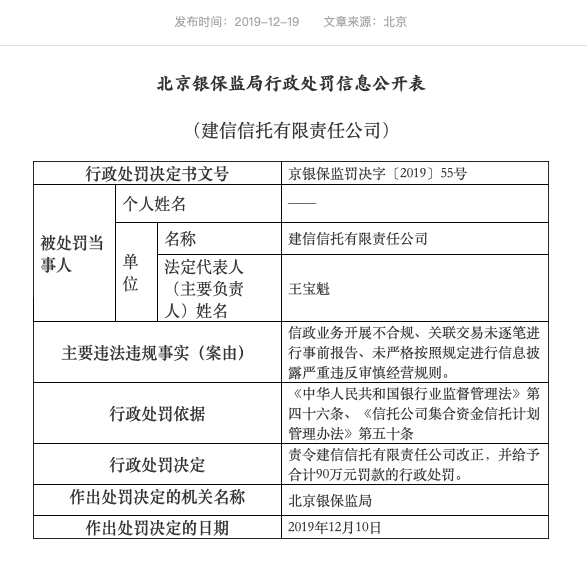 为此,北京银保监局责令中信信托、建信信托改正、并分别给予合计90万元罚款的行政处罚。