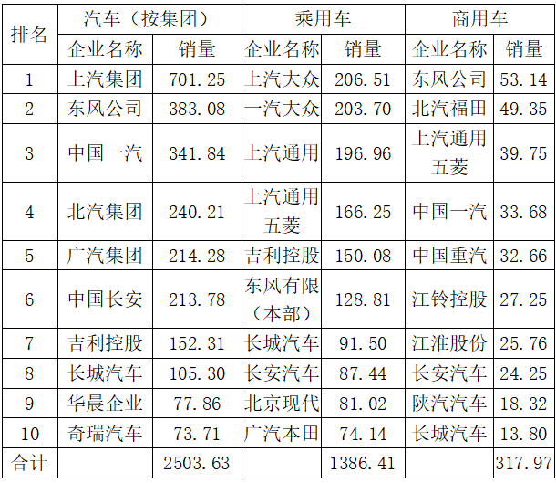 从头部企业表现来看,中国汽车工业协会数据显示,今年1-11月,汽车销量排名前十位的企业集团销量合计为2087.2万辆,高于行业增速1.3个百分点,占国内汽车销售总量的90.3%,高于上年同期1.3个百分点。其中,上汽集团销量超554万辆、东风集团销量为324.77万辆、吉利汽车总销量超123万辆。