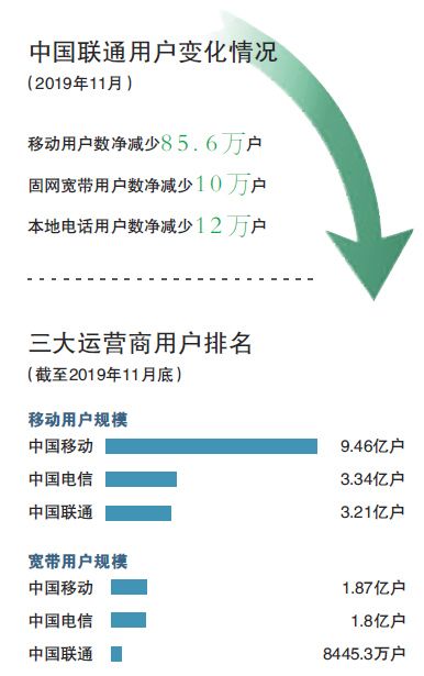 根据中国联通公告中披露的数据,今年11月,中国联通移动用户数当月净减少85.6万户,固网宽带用户数当月净减少10万户,本地电话用户数当月净减少12万户,移动业务用户数和固网业务用户数双双呈现下滑态势。
