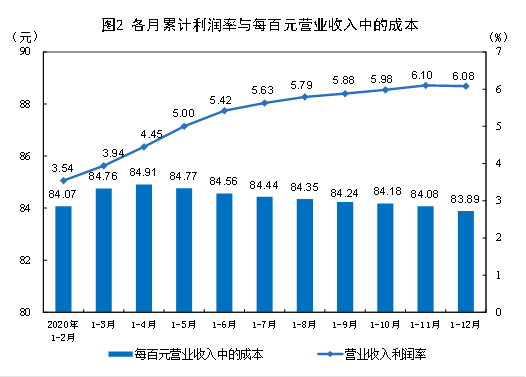 2020年,规模以上工业企业每百元营业收入中的成本为83.89元,比上年减少0.11元;每百元营业收入中的费用为9.17元,比上年增加0.14元。