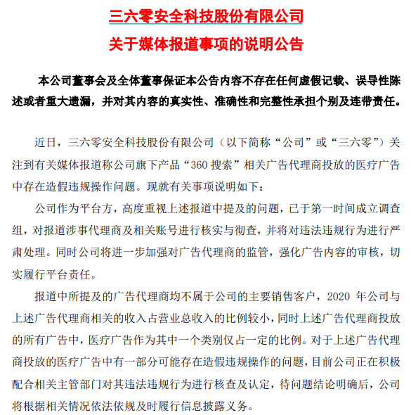 公告称,报道中所提及的广告代理商均不属于公司的主要销售客户,2020年公司与上述广告代理商相关的收入占营业总收入的比例较小,同时上述广告代理商投放的所有广告中,医疗广告作为其中一个类别仅占一定的比例。对于上述广告代理商投放的医疗广告中有一部分可能存在造假违规操作的问题,目前公司正在积极配合相关主管部门对其违法违规行为进行核查及认定,待问题结论明确后,公司将根据相关情况依法依规及时履行信息披露义务。