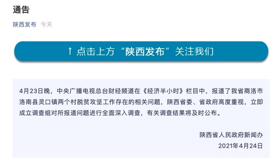 24日晚间,陕西人民政府对央视记者曝光洛南脱贫摘帽掺假作出回应:立即成立调查组对所报道问题进行全面深入调查,有关调查结果将及时公布。