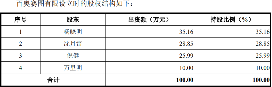 发行人前身百奥赛图有限设立于2009年11月,注册资本100万,由沈月雷、倪健、杨晓明、万里明各出资28.85万元、25.99万元、35.16万元和10万元。