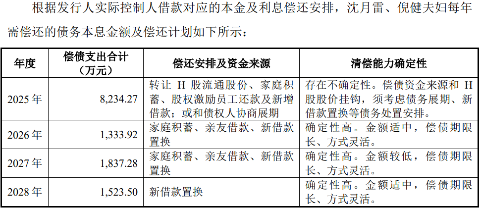 公司称,双方通过其持有的发行人股权(其中H股股份处于可流通状态)、员工持股平台被激励对象向实际控制人的欠款以及实际控制人家庭自有财产和薪酬收入归还。
