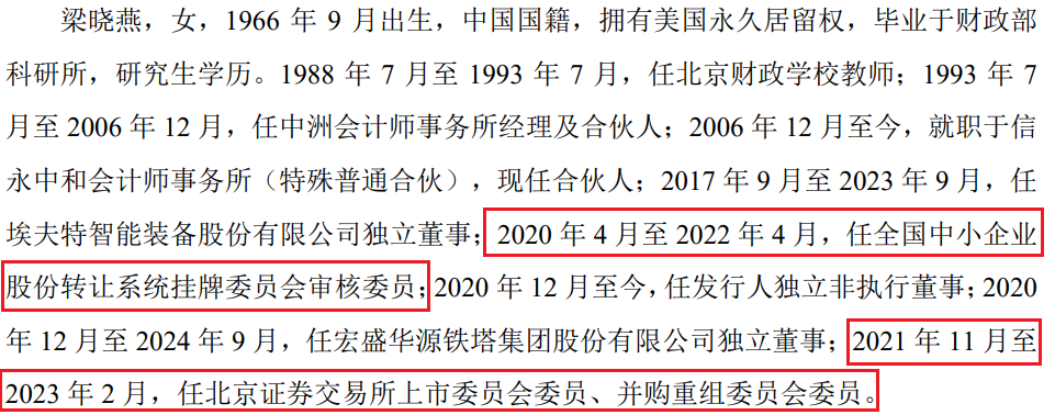 值得注意的是,拥有美国绿卡的独董梁晓燕毕业于财政部科研所,2020年12月公司变更股份公司起至今一直担任发行人独立董事,其曾在新三板和北交所担任过审核委员和上市委员。