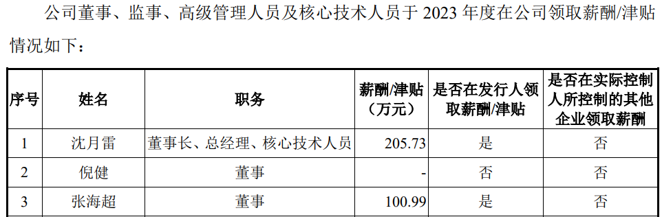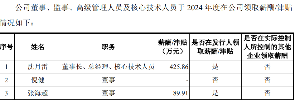有意思的是,当张海超等董监高2024年较2023年薪酬出现下滑时,董事长沈月雷2024年年薪却高达425.86万元,较2023年的205.73万元出现了翻倍。