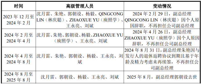 从2024年2月开始,QINGCONG LIN(林庆聪)、ZHAOXUE YU(庾照学)、朱艳及郭朝设均不但副总经理,前两名是因个人原因辞职,朱艳系退休,郭朝设(出生于1971年年仅54岁)因去世离任。