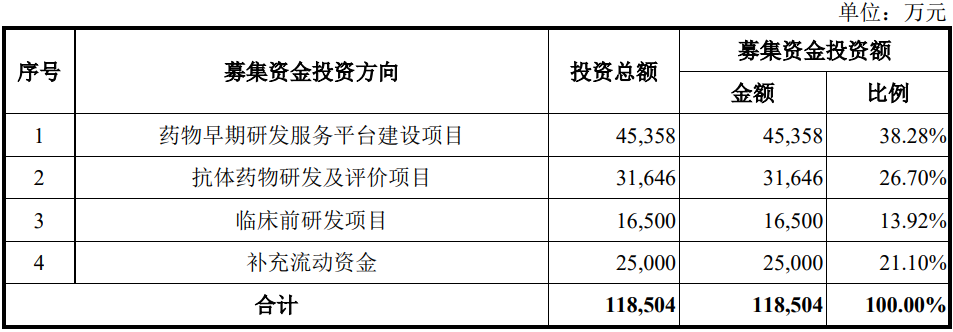 公司此次募资资金118,504万元,拟用于药物早期研发服务平台建设项目、抗体药物研发及评价项目、临床前及临床研发项目、补充流动资金,其中,募资补流2.5亿元。