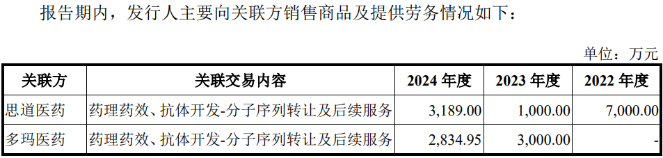 思道医药系公司联营企业多玛医药的全资子公司,主要从事创新药研发业务。2022年 6 月,发行人与思道医药签订 3 项合同,约定向其转让通过“千鼠万抗”项目发现的抗体分子;2022 年-2024年,发行人通过向其转让抗体分子、后续服务等多玛医药和思道医药共取得收入分别为 7,000 万元、4,000元和6,023.95万元,三年累计向上述2家公司销售收入17,023.95万元。
