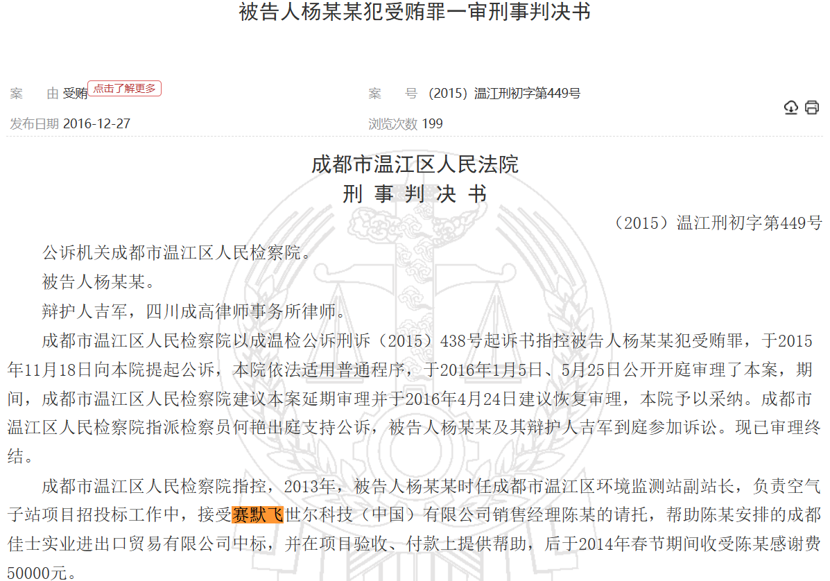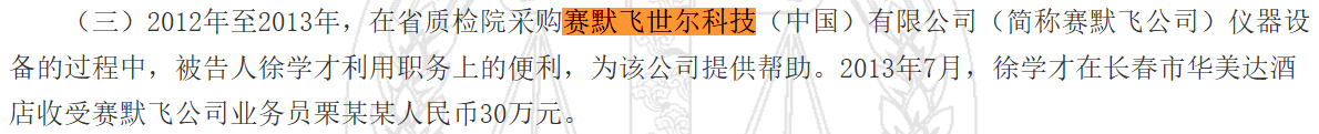 据《徐学才受贿一审刑事判决书》《柴丹受贿罪一审刑事判决书》《杨某某犯受贿罪一审刑事判决书》显示,赛默飞世尔科技销售经理等均向上述受贿人员行贿。