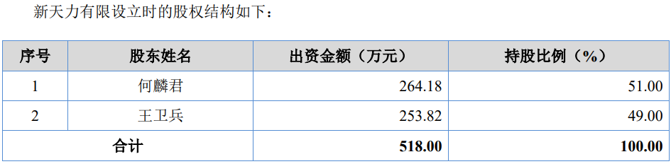 2005年8月,何麟君、王卫兵各出资264.18万元、253.82万元设立了浙江新天力包装制品有限公司(发行人前身,简称新天力有限)。