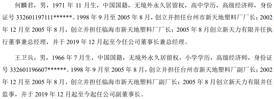 招股书显示,何麟君高中学历,担任公司董事长兼总经理,王卫兵小学学历,担任公司副董事长。