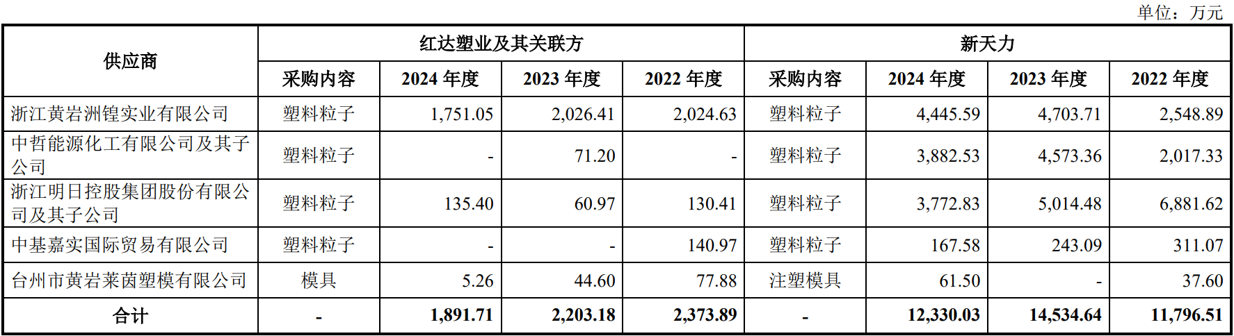 需注意的是,报告期内,公司与红达塑业及其关联方采购额均在10万元以上的主要重合原材料供应商有黄岩洲锽实业、明日控股集团等5家,发行人对重合供应商采购金额及比例较大。