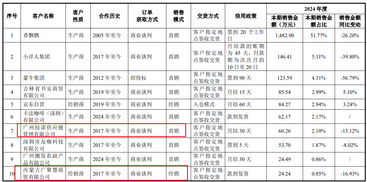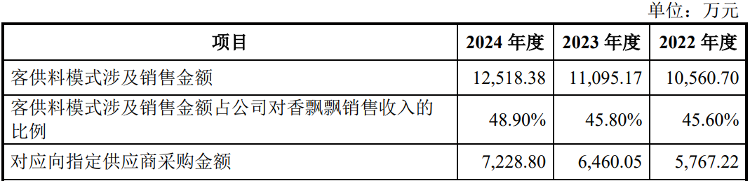 两家大客户收入下滑香飘飘2025年上半年出现亏损,与其采用“厂中厂”或“配套建厂”的合作模式,报告期1.95亿元的供应商采购由香飘飘指定(指定供应商中有发行人实控人配偶持股的、有总裁曾向地方官员行贿的企业),多家大客户还未设立就已合作,2022年对江天科技的采购额超过第四大供应商却未列入前五供应商之中
