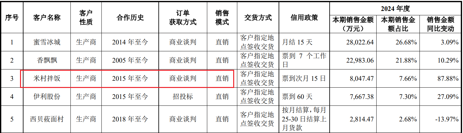 招股书披露,米村拌饭为发行人2023年、2024年第四、第三客户,对其销售金额分别为4,283.22万元、8,047.47万元,与其合作为延边米稻实业有限公司及其下属企业,据问询函显示,双方合作始于2015年,但工商资料显示该企业设立于2020年12月,较开始合作的时间晚了5年。同时,其他多家客户出现了“穿越”。