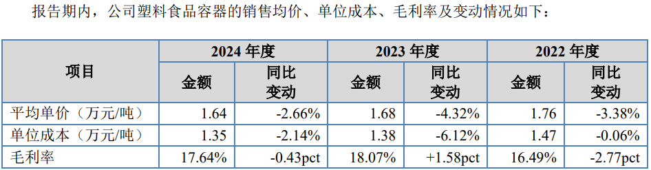 2021-2024年,公司塑料食品容器平均单价分别为18.19元/千克、 17.58 元/千克、16.82 元/千克以及 16.37 元/千克,连续三年下降。或由此原因,公司的毛利率出现了波动,报告期内的各年的毛利率均不及2021年,2024年,公司的毛利率为18.30%,较2023年的18.78%出现了微幅下降。