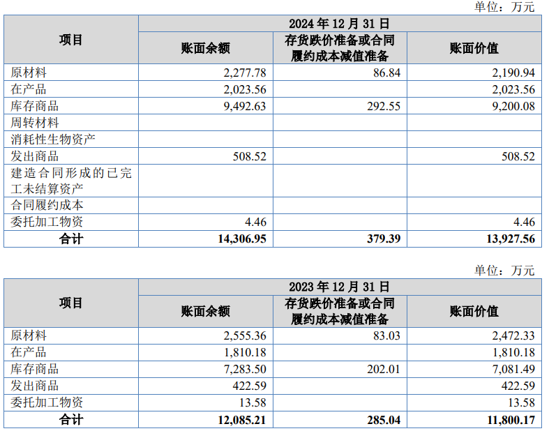 招股书显示,2024年,公司原材料的库存为2,277.78万元,较2023年的2,555.36 万元,增加值-277.58万元。