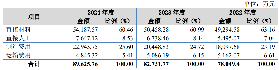 从2024年数据来看,原材料采购总额为 59,208.55万元,体现主营业务成本的直接材料金额为54,187.57万元,占主营业务成本的比重为60.46%。同时,2024年,研发费用中的直接投入的材料费用为1,404.11 万元。