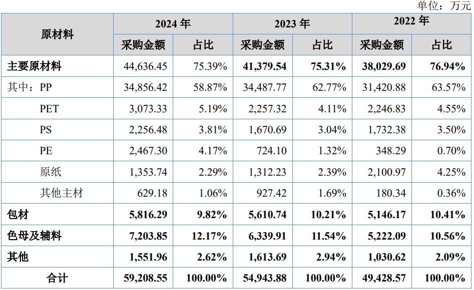 公司对外采购的主要原材料为 PP、PET、PS、PE、原纸等,除此之外,公司仍需向外采购包材、色母及辅料等用于生产经营。报告期内,公司主要原材料及占采购总额的比例如下所示: