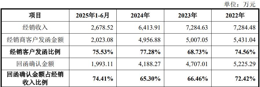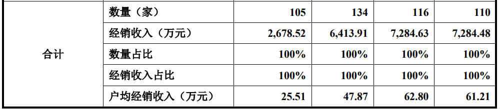 报告期内,发行人经销商家数分别为110家、116家、134家和105家,逐年出现了增加,但其经销收入和户均经销收入均下滑,乌龙的是,2022年经销收入为7,284.48万元,根据110家计算,其户均经销收入应为66.22万元,但问询函列表中为61.21万元。