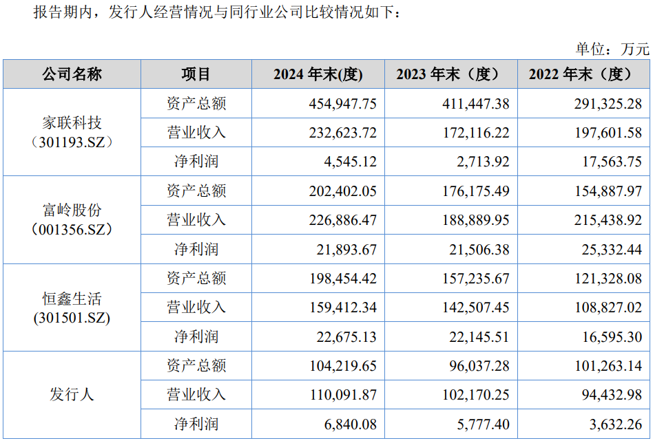 2022年-2024年,公司实现的营业收入分别为94,432.98万元、102,170.25万元和110,091.87万元,逐年攀升,不过,相当同行而言,处在垫底的位置。同时,公司的净利率低于富岭股份和恒鑫生活。