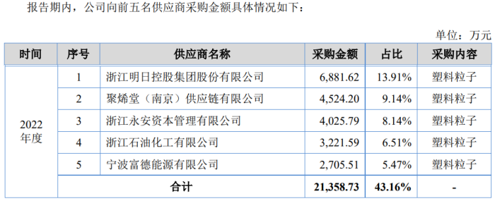 与客户一样,公司对供应商的采购也较为蹊跷。招股书显示,2022年,公司的第四供应商为浙江石油化工,采购金额为3,221.59万元,而这数据少于对江天科技的采购额,但江天科技为何未出现在2022年前五供应商名单中?