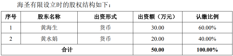 此后股转和增资中,又引进了黄海生的姐夫王增华、黄海生的妹妹黄彩丽作为股东,形成了以黄海生为实控人的家族企业。
