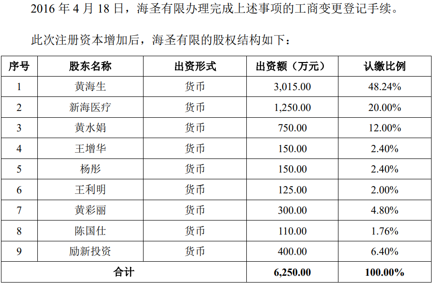 同时段,陈国仕以其本身从事的业务存在资金需求为由,和黄海生协商向其转让所持有的海圣有限全部股权,但其最终转让价仅5.85元/单位注册资本,低于同时期退出的新海医疗。