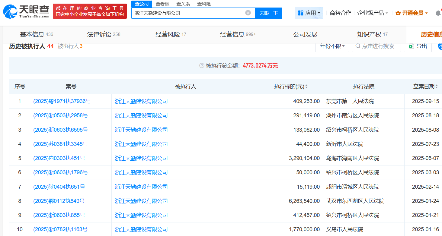 天眼查显示,成雪刚控制的天勤建设涉司法案件217起,其中作为被告185起,涉案金额约1.03亿元,该企业44次纳入被执行人涉案总额4,773.03万元,其2023年被宁波市鄞州区人民法院出具了“限制消费令”。