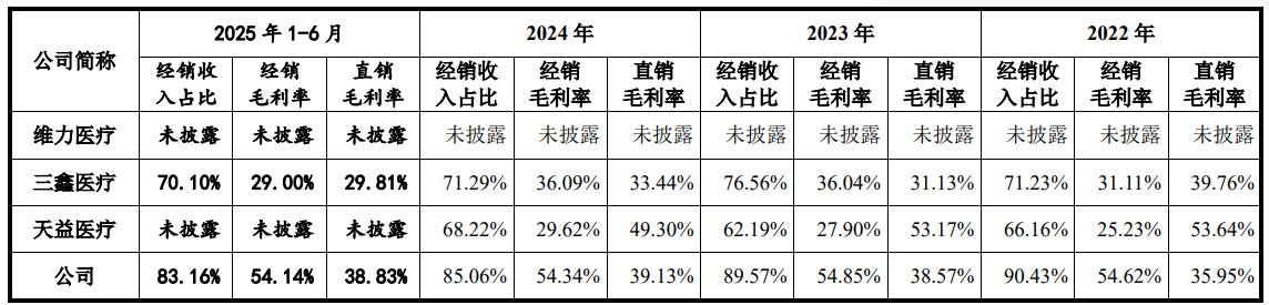 同行中,三鑫医疗及天益医疗经销收入占比均在80%以下,经销毛利率均在40%以下。