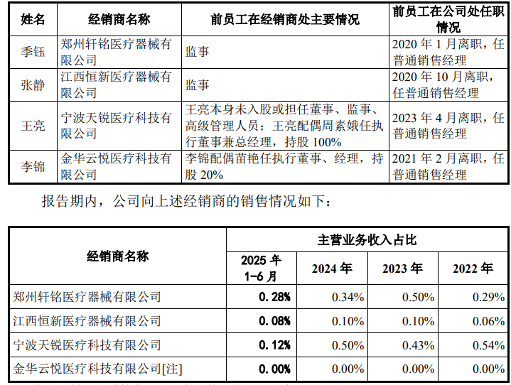 另外,经销商中还存在季钰等4名销售经理入股或担任董事、监事、高管等主要职务的企业。其中,轩铭医疗设立于2018年,即季钰在担任公司的销售经理的同时还担任经销商的监事,而王亮配偶设立的经销商天锐医疗也早于其离职时间。