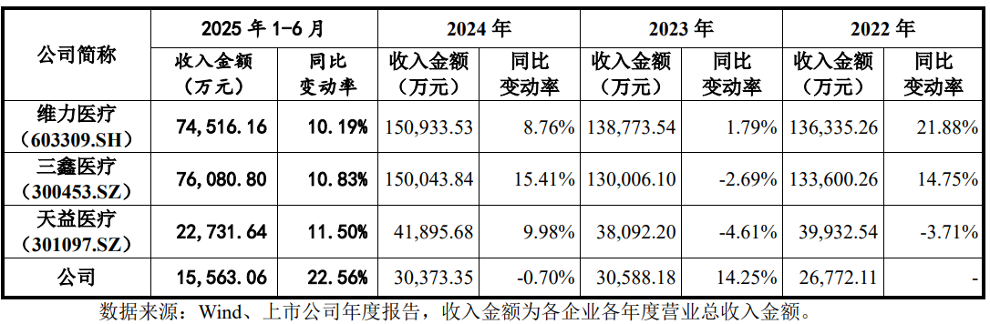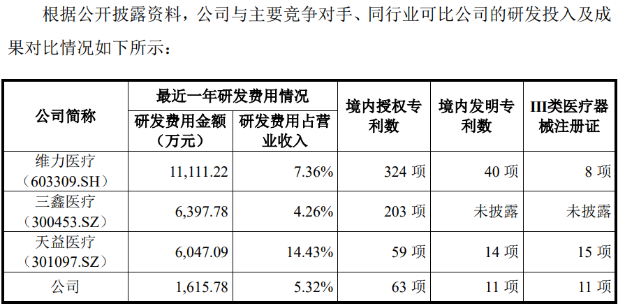 同期同行的研发占比平均值分别为5.37%、6.31%、8.69%和7.02%,逐期增长,公司虽研发投入占比高于三鑫医疗,但投入的金额仅约其1/4。