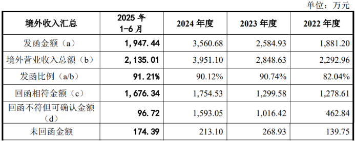 业绩波动收入变动趋势与同行不一致,境外收入持续快速增长,函证境外客户收入时回函不符金额3,100多万占发函总额的比重约31%,研发投入占比低于同行销售费用投入占比高于同行,2024年产能利用率及产销率均下滑仍募资拓产扩张,募资规模3.7亿元大于收入规模,1.38亿元用于研发检测中心项目是报告期研发总投入的2.5倍,在建工程也包含研发检测及营销服务基地疑似与募资项目重复,两家施工商1家曾被“限消”1家拖欠税款均数十次被执行金额在数千万以上