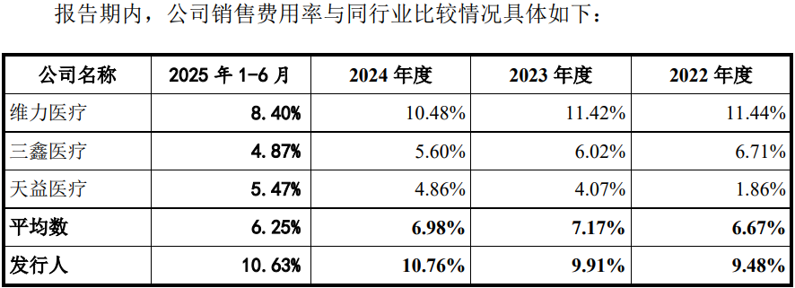报告期内,发行人各期销售费用分别为2,539.03万元、3,030.02万元、3,268.83万元和1,653.69万元,占收入比例分别为9.48%、9.91%、10.76%和10.63%,销售费用率逐年攀升,高于同行且同行呈现下滑趋势。