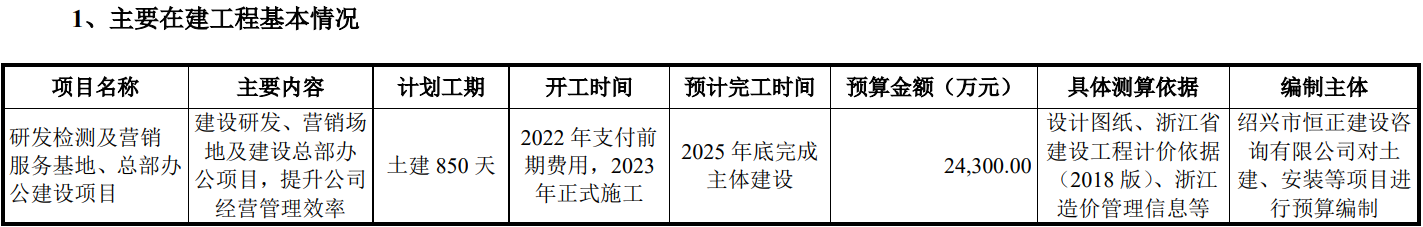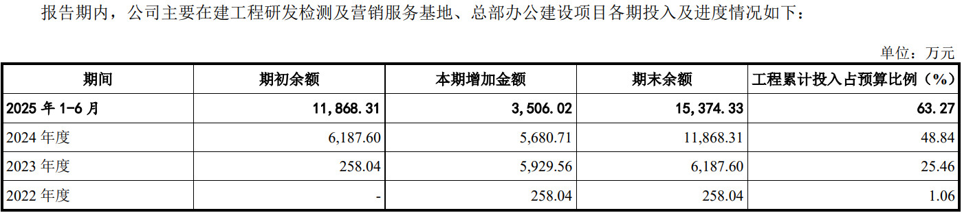 报告期各期末,公司在建工程余额分别为273.14万元、6,622.46万元、11,948.84 万元和15,576.98万元,在建工程主要为研发检测及营销服务基地、总部办公建设项目。