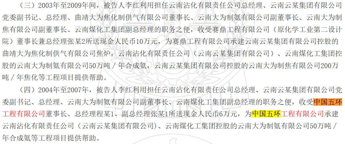 据云南省昆明市中级人民法院发布的案号为(2016)云01刑初字182号的《李红受贿一审刑事判决书》显示,李红利用担任云南沾化有限责任公司总经理、云南煤化工集团副总经理等职务之便,收受中国五环工程有限公司董事长、总经理程某、副总经理张某所送现金人民币6万元,为中国五环工程有限公司承建云南沾化有限责任公司(云南云某集团有限公司)、云南煤化工集团控股的云南大为制氨有限公司50万吨∕年合成氨等工程项目提供帮助。