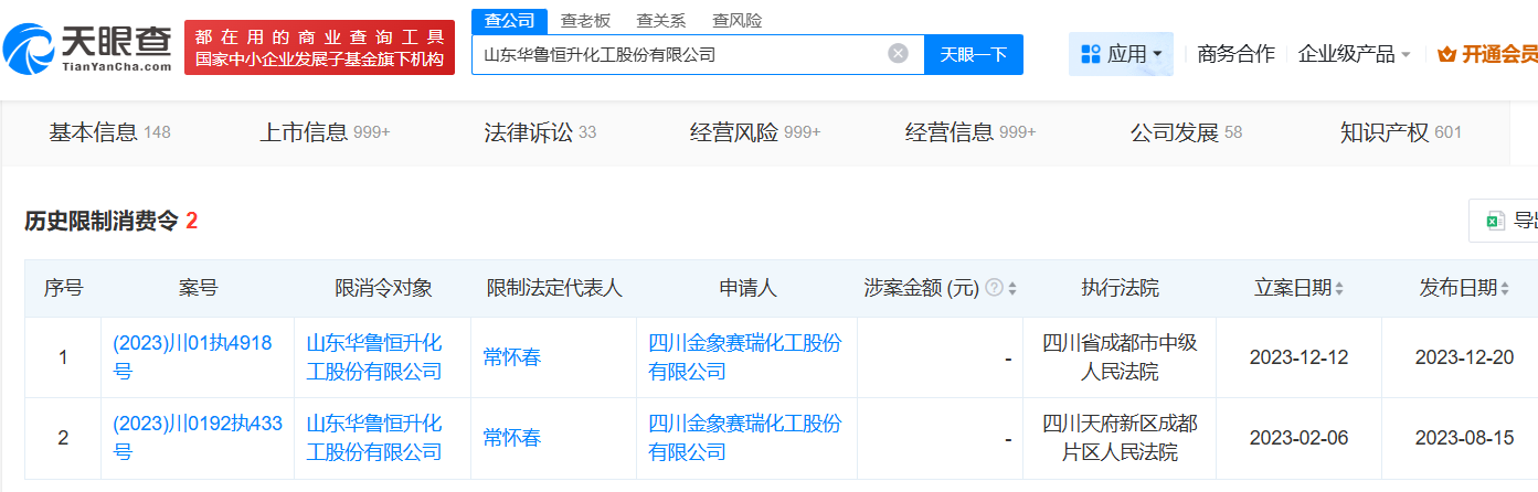 天眼查显示,公司2023年第五客户中山东华鲁恒升化工股份有限公司也曾出现了两次“限消”