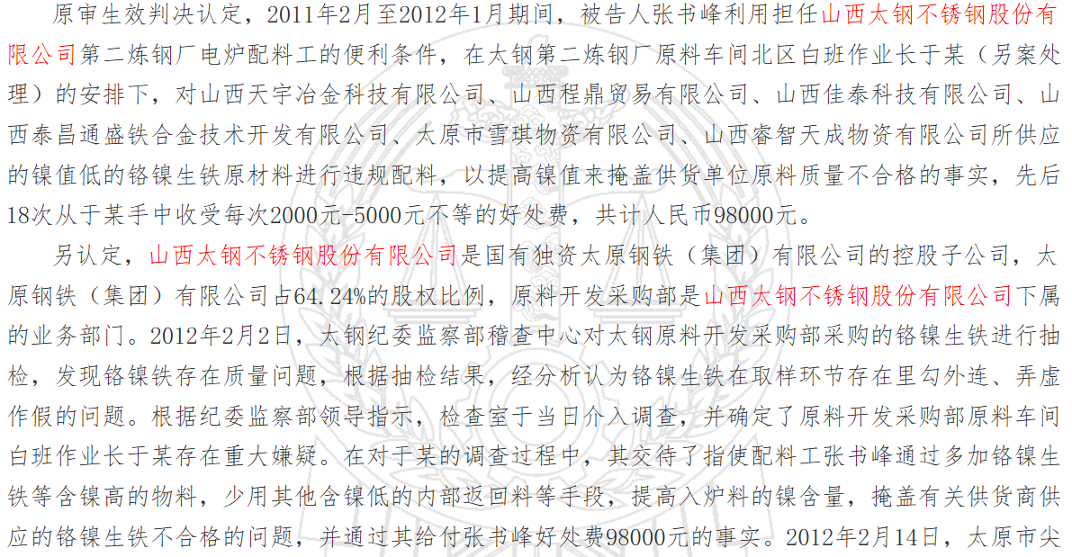 裁判文书网中《胡建钢、山西城财钢铁有限公司受贿、行贿、挪用公款二审刑事裁定书》、《李源广利用影响力受贿罪二审刑事裁定书》《张书峰再审刑事判决书》显示,山西太钢不锈钢股份有限公司涉多起员工受贿侵占案。