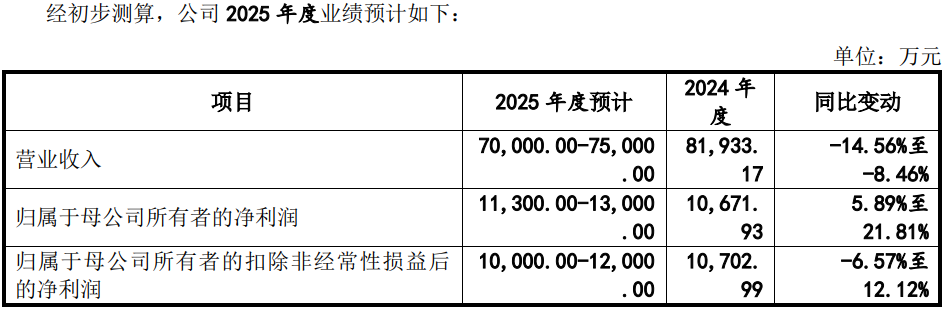 公司预计2025年度营业收入约为70,000.00万元至75,000.00万元,同比变动幅度约为-14.56%至-8.46%;归属于母公司所有者的净利润约为11,300.00万元至13,000.00万元,同比变动幅度约为5.89%至21.81%;归属于母公司所有者的扣除非经常性损益后的净利润约为10,000.00万元至12,000.00万元,同比变动幅度约为-6.57%至12.12%。