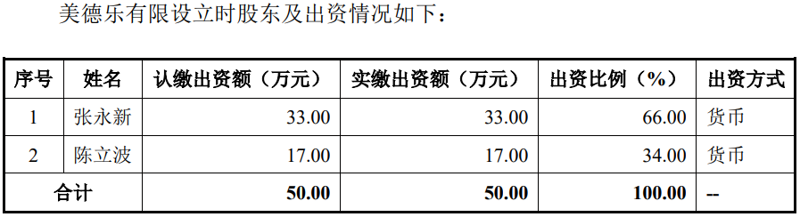 美德乐成立于2009年,由张永新和陈立波各出资33万、17万共同设立, 不过,陈立波并未参与公司的经营管理。