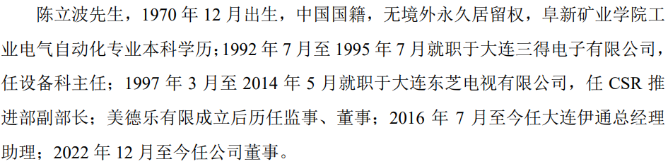 根据陈立波履历,公司设立时,其正在外资大连东芝电视有限公司担任CSR推进部副部长,美德乐有限成立后历任监事、董事。