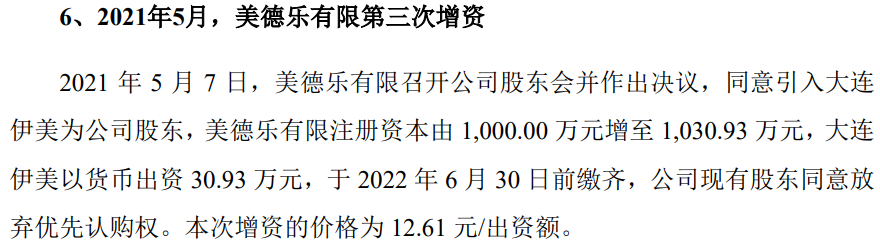 2023年6月,美德乐再次引入新股东鼎祥名仕、立夏一号,公司注册资本由5,509.0325万元增至5,612.3267万元,其中688,628元出资由立夏一号以货币方式认缴;344,314元出资由鼎祥名仕以货币方式认缴,增资的价格为29.04元/股。