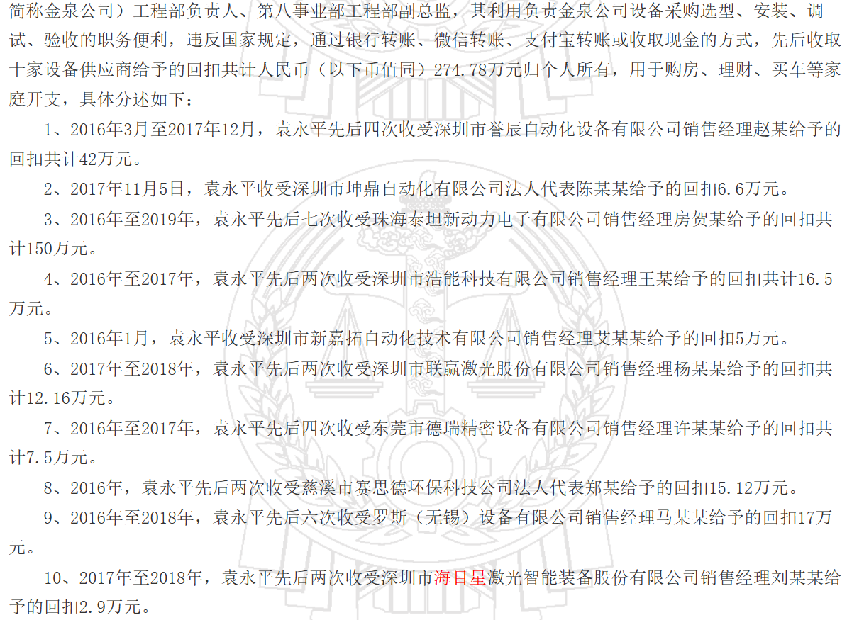 湖北省荆门市掇刀区人民法院做出的案号为(2021)鄂0804刑初30号的《被告人袁永平犯非国家工作人员受贿罪一案一审刑事判决书》显示,原湖北金泉新材料有限公司(以下简称金泉公司)工程部负责人、第八事业部工程部副总监袁永平先后两次收受深圳市海目星激光智能装备股份有限公司销售经理刘某某给予的回扣2.9万元。