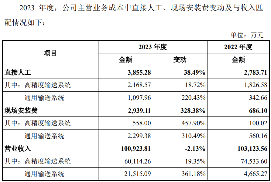 2023年,公司收入同比2022年下降了2.13%,但2023年度直接人工、现场安装费较2022年度分别增加1,071.58万元、2,253.01万元,增幅分别为38.49%、328.38%。