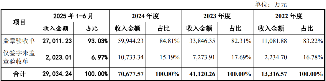 报告期各期,发行人仅签字未盖章验收单据金额分别为2,234.70万元、7,273.91 万元、10,702.36万元和2,023.01万元,累计金额约22,233.98万元。