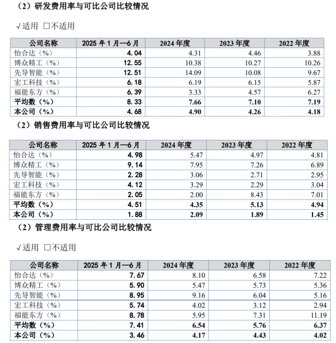 报告期内,公司的研发费用发费用分别为4,313.91万元、4,296.65万元、5,574.49万元和3,331.59万元,占营业收入的比例分别为4.18%、4.26%、4.90%和4.68%,在同行中投入的金额垫底,占比略高于怡合达,大幅低于平均值,同时销售费用及管理费用也显著低于同行。